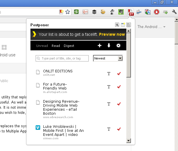 On the desktop, I have installed two third-party Chrome extensions. Postponer Adder offers one-click clipping of the current page to Read it Later. It also integrates with Google Reader to allow easy clipping of any article using the coloured buttons to the left of each article’s title, which you can see in the screenshot above. Postponer Manager places a button in the Chrome toolbar which opens your Read It Later list in a small popup window.