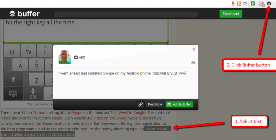 The Buffer service is fully cross-platform. On the desktop I use the Chrome extension which allows one-click Buffering of selected text and shortened page URL from an icon in the browser’s toolbar.