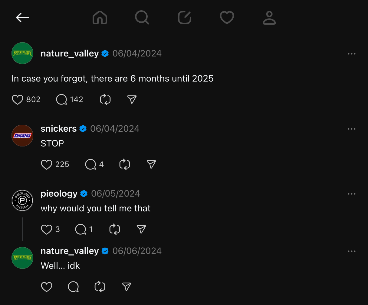 On the other hand, instead of only posting, you’ll prioritize participating in conversations to see meaningful growth. Here's an example of how other brands responded to this post from the @nature_valley account:
