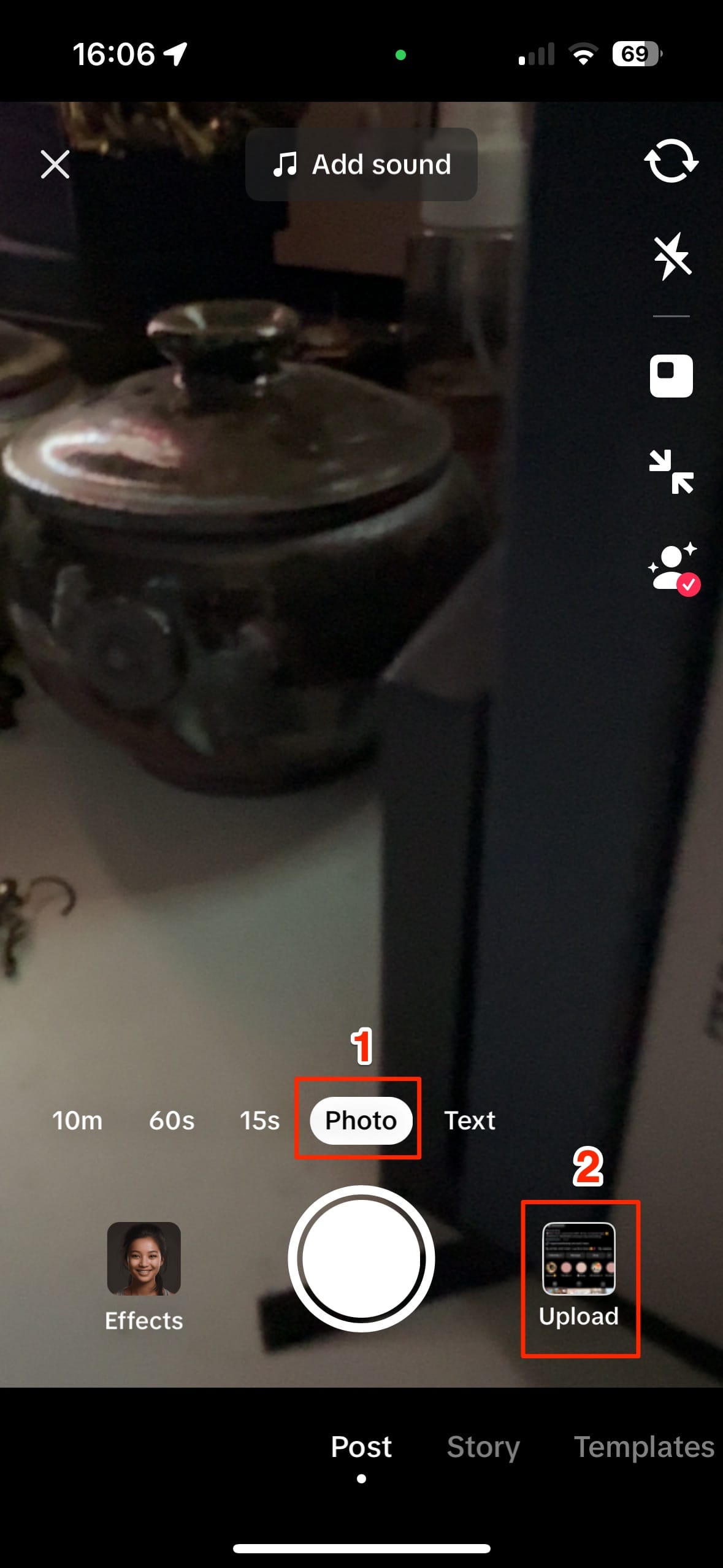 Open TikTok and tap the “+” button to create a new post. Your screen should open to your front or back camera already on “Photo” – if it isn’t, swipe to select "Photo".