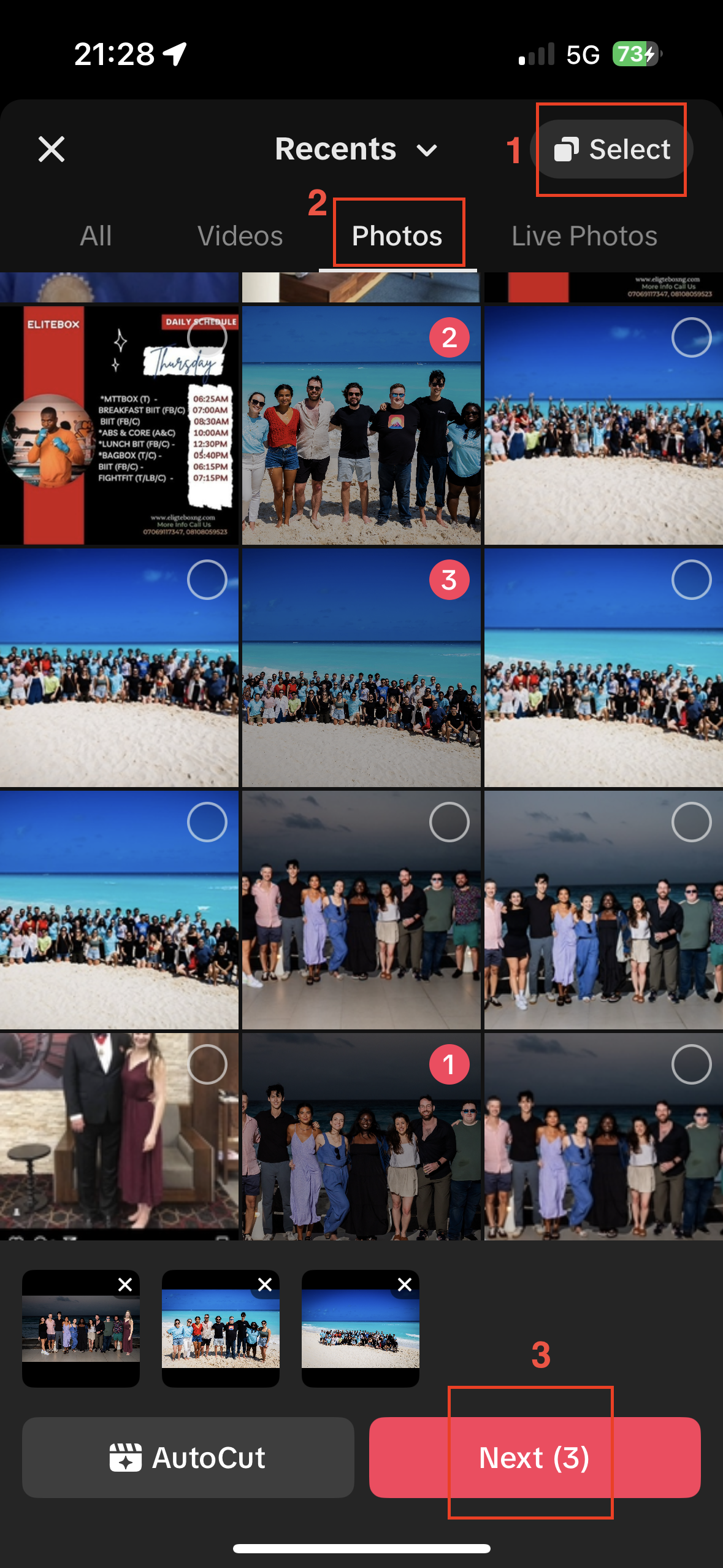 Swipe to the “Photos” section of your camera roll and tap "Select" in the top right corner of your screen to add multiple photos. Select as many photos as you need – you can add up to 35 photos. Then, tap “Next”.