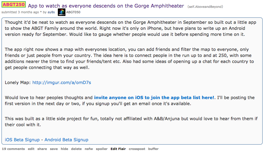 Once I had it in a good state, I submitted it to Apple for TestFlight Beta Review and setup a invite page for people to request their own TestFlight invites. I then took to the Above & Beyond Reddit to invite some fans to check it out, within a few hours the map was already filling up with people heading to the Gorge from around the US. Along with comments from Android users requesting an Android version, great validation!