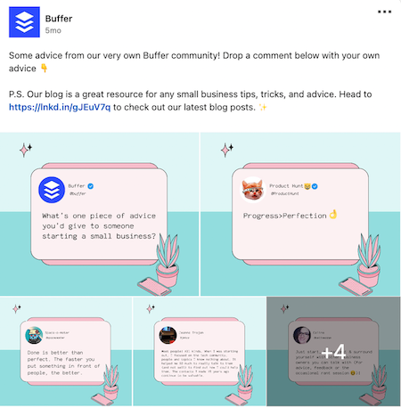 I think this post was our most engaged post because it featured our Buffer community and also encouraged others to join in with their own advice. Since there were multiple images to go through, people spent more time on the post swiping through each piece of advice. The theme also stays true to our mission, which is to help small businesses.