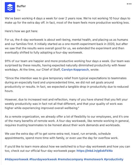 EVERYONE AT BUFFER ONLY WORKS 4 DAYS A WEEK AND IT’S NOT LIKE THEY’RE DOING FOUR 10 HOUR DAYS THEY’RE ACTUALLY WORKING LESS THAN 40 HOURS A WEEK BUT THEY’RE STILL SUPER PRODUCTIVE AND THEY’RE FULLY REMOTE AND LET THEIR TEAM WORK WHATEVER HOURS WORK BEST FOR THEM AND LIVE ANYWHERE pic.twitter.com/AUoKLeOdWR