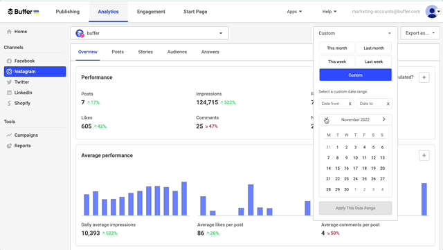 - Select if you want to sort by impressions, likes, engagement rate, etc.