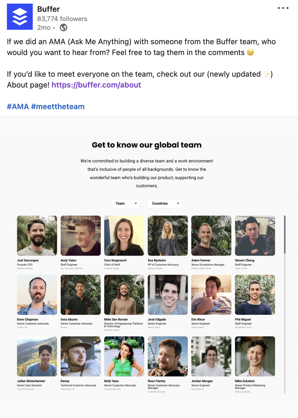 This is an interesting one because it actually didn’t end up with many comments, but still had a high engagement rate. This post was shared as a PDF carousel, which we’ve seen a trend where these kinds of posts get a really high engagement rate on LinkedIn. Our posts featuring the team and focusing on our culture have historically performed well, so it’s no surprise that this post asking people who they’d like to do an AMA with from Buffer was our top post.