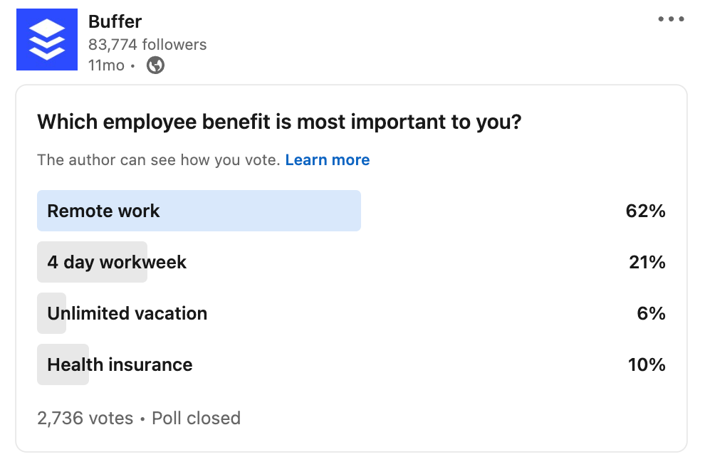 I love using polls on LinkedIn because they are a great way to start discussions. My strategy with polls on LinkedIn has been to use them as a way to talk about work culture, and I felt like benefits were something that people had been talking about a lot lately, especially since there’s been a lot of back-and-forth on whether remote work should be considered a benefit. This question asking people to choose one benefit that they think is most important started a discussion in the comments because a lot of people had different opinions.