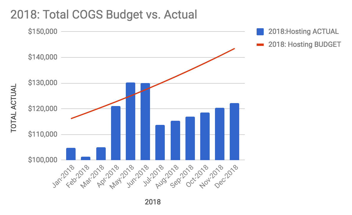 For 2018, we budgeted $1,549,000 for Cost of Goods Sold. This includes Hosting fees like Amazon Web Services (AWS), Compose, Twitter, Fivetran, Cloudflare, MongoDB Cloud, Amazon Redshift, and Google Cloud Platform. We also budget for merchant fees within Cost of Goods Sold and today our merchant fees come out to about 4.7% of our revenue.