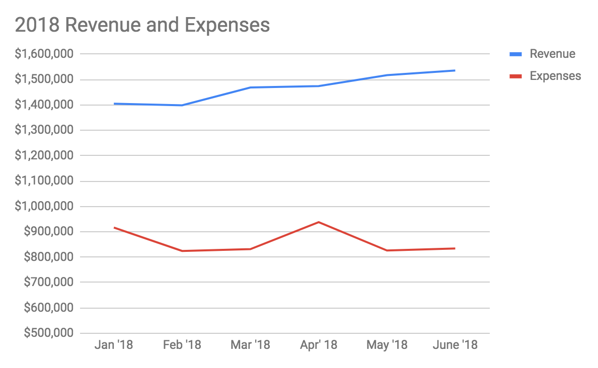 Budgeting is a great way to understand how we prioritize spending, but that’s only half the equation. When we set our budget for 2018 we did so with specific revenue goals in mind. We think it’s really important to make sure that we’re not only on track to meet our budget goals, but that we’re also on track with what we projected for anticipated revenue. For 2018, one of our goals was to make sure that our expenses didn’t outpace our revenue in order to make sure we weren’t burning cash. Here’s a glance at where we’re at so far!