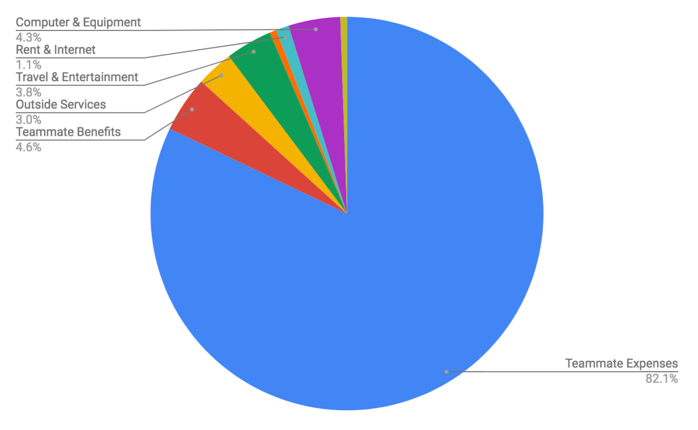 If you’ve been following Buffer’s journey for any length of time you likely know that we’re committed to sharing our journey transparently, including what we pay each team member. We also believe that the work and value each teammate brings to Buffer isn’t limited to where they work from and that’s why last October we made the decision to benchmark our compensation to the San Francisco labor market, regardless of where a teammate lives. Perhaps it won’t be surprising then to learn that of our total operating budget, Teammate Expenses, including compensation and payroll taxes, make up 82% of our total operating budget. Take a look!