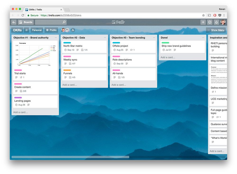 - There’s a list for each objective that I set, and then a card for each key result within that objective.