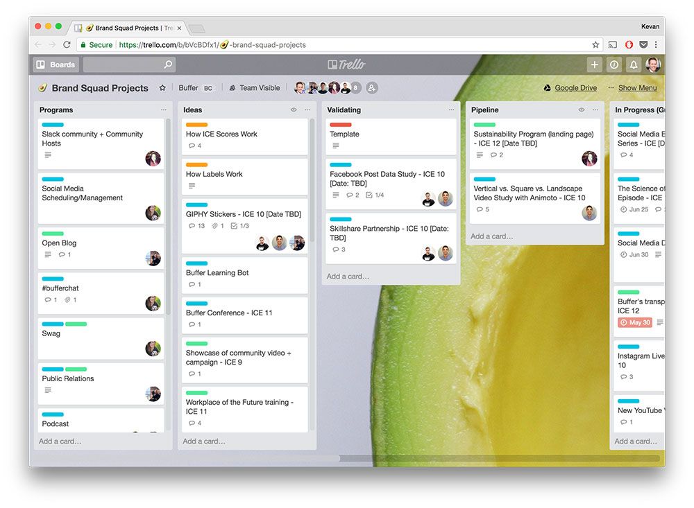 Each squad has the flexibility to organize itself in the way that it sees fit. Both squads have adopted a similar-looking Trello board to track and communicate the projects that are ongoing. The above screenshot is from the Brand Squad, which focuses on our awareness efforts. (The avocado background is a nod to a favorite, team-building Slack app we use called HeyTaco.)
