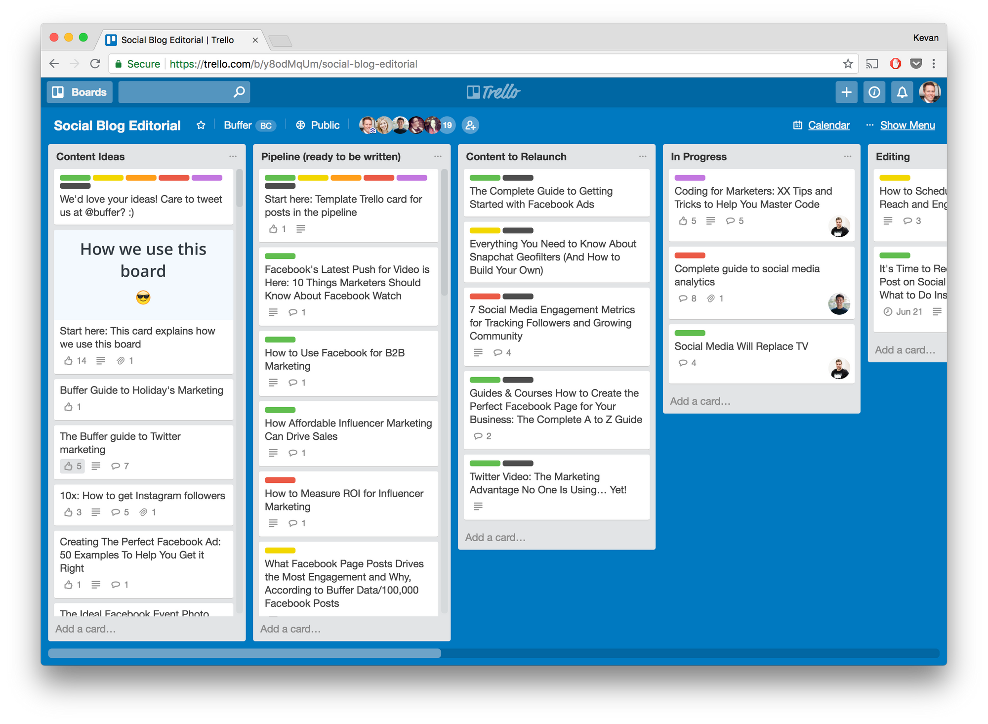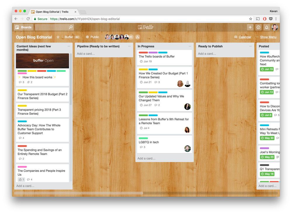 The blog you’re reading now — our Buffer Open blog — gets its content from this Trello board. If you squint, you can see this very blog post at the top of the “In Progress” list. We use this board to organize all the content that goes on the Open blog and to organize our entire editorial process from idea to draft to editing to publish.