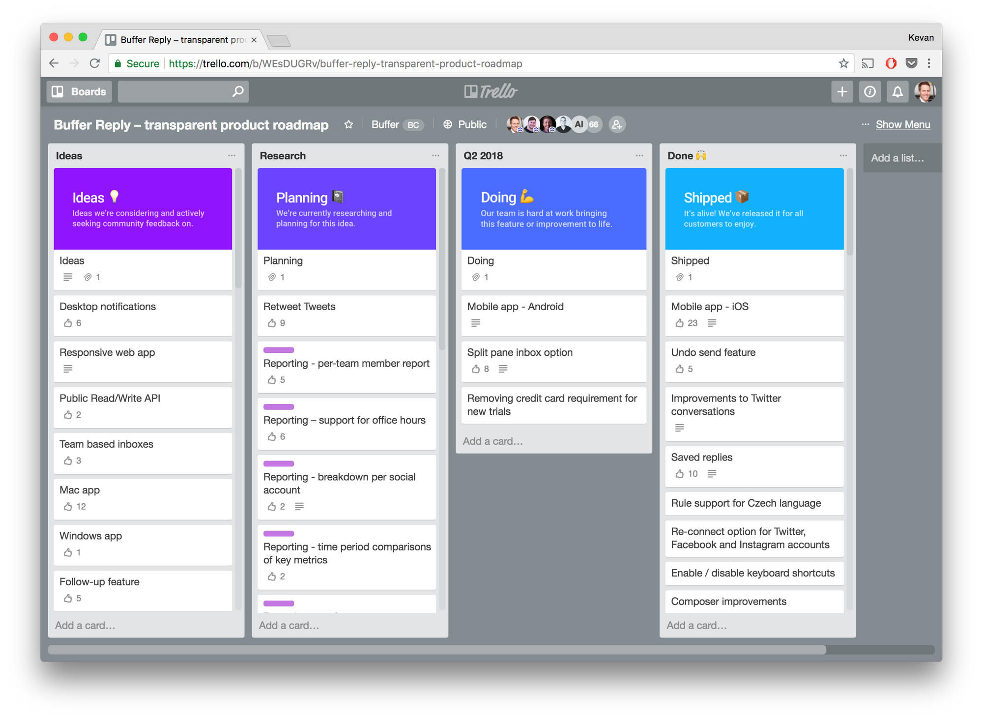 - As with our Buffer product roadmap, the Reply roadmap takes advantage of the Trello Add-on for Voting so that the community can upvote favorite features.