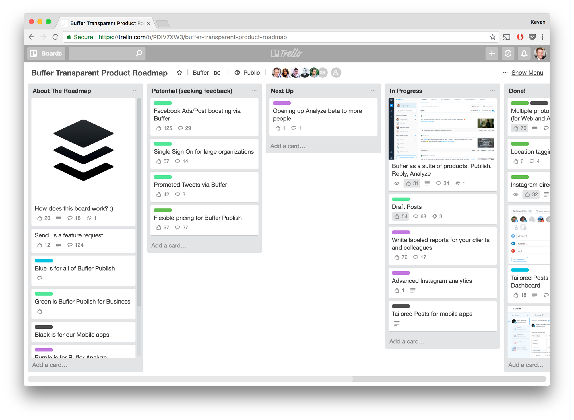 We created this board in order to have a public place for customers and community members to track the progress of what we’re building in the Buffer product. The board is visible to anyone, and we allow people to comment on all of the cards. When we tease a new product or update users on what’s coming, we’ll often link to this board from product email newsletters.