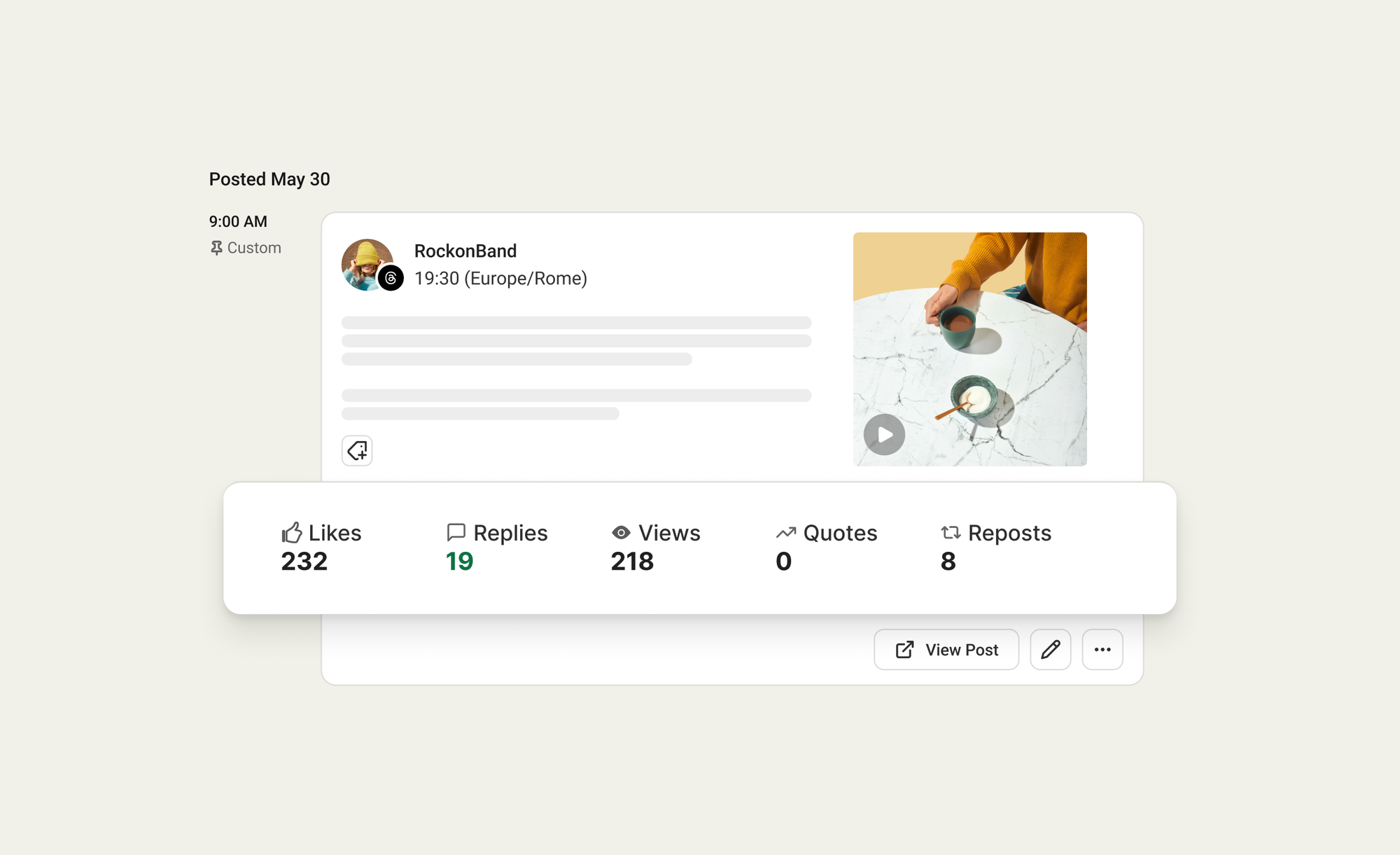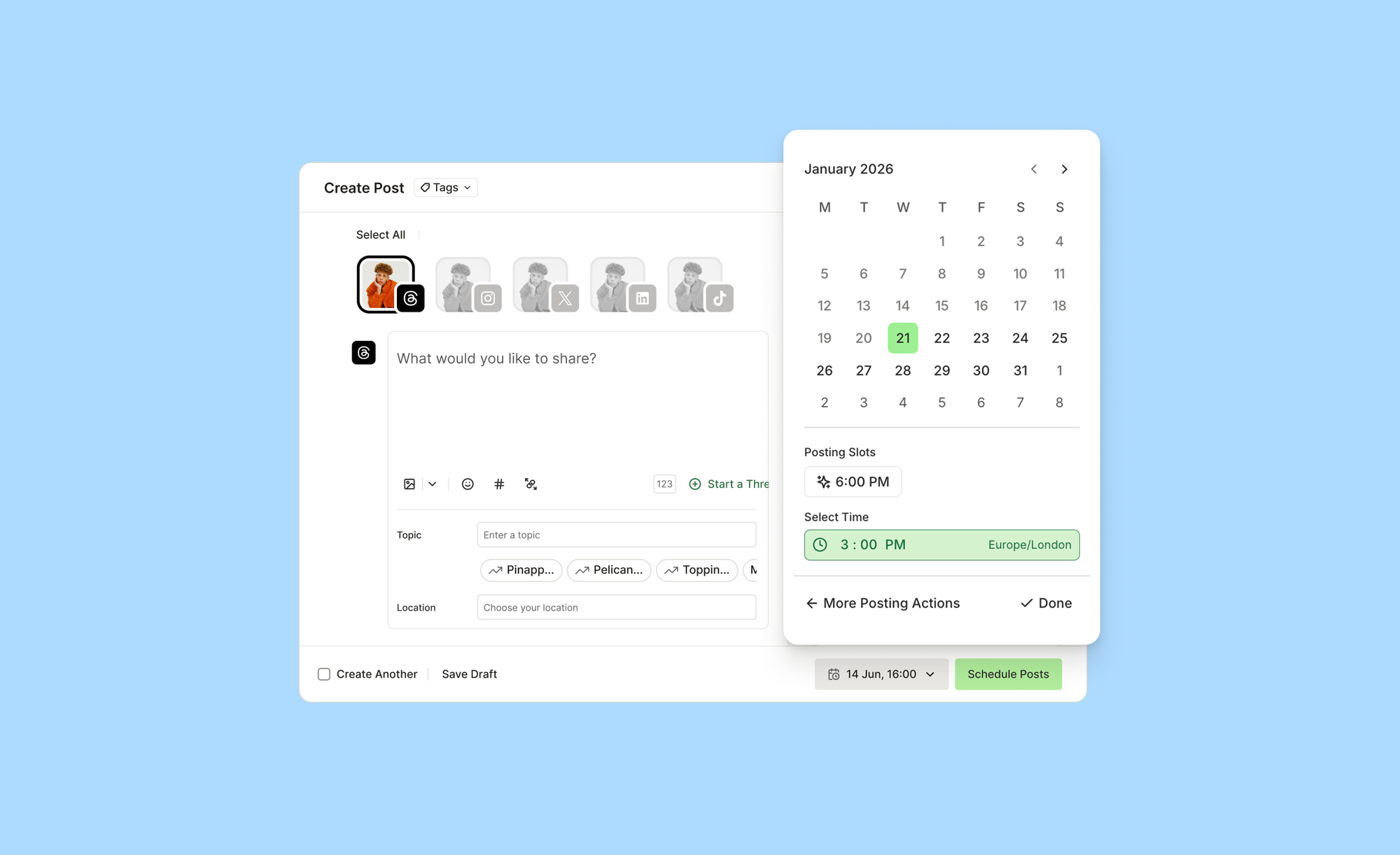 Crosspost to other platforms. Create once in Buffer, publish to Threads and everywhere else simultaneously. Or customize for each channel.
