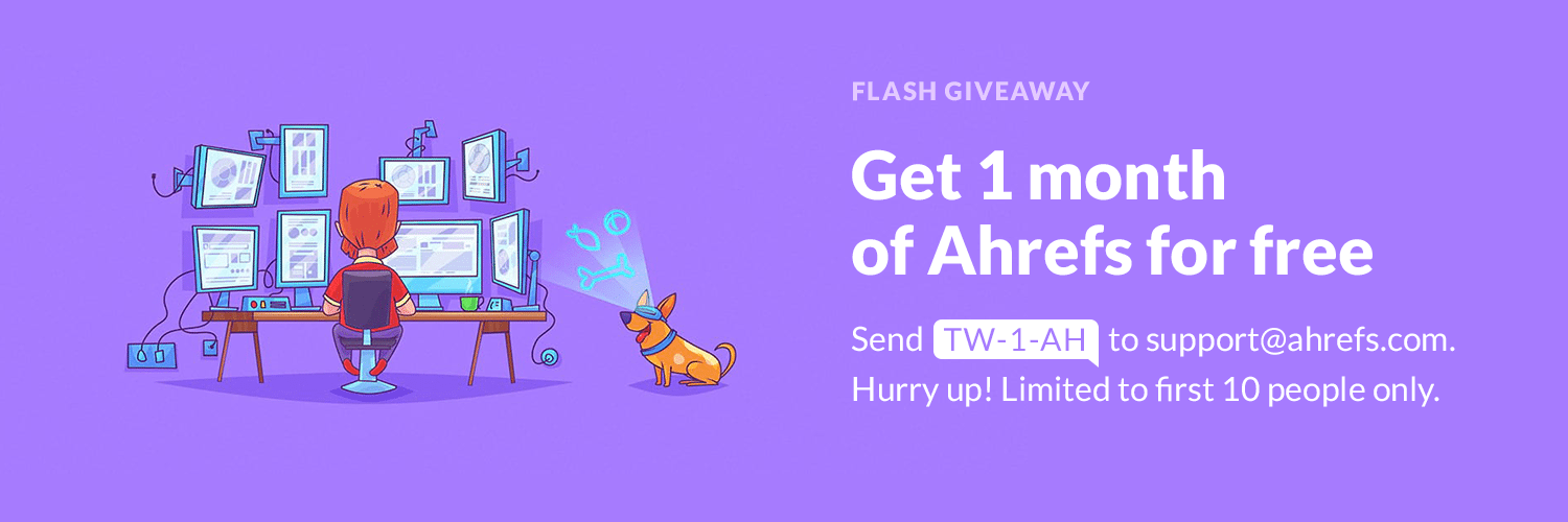 The concept was simple: use our Twitter header image to announce a flash giveaway, then monitor responses and engagement levels. We kept the mechanics easy. The first 10 people to send in an email with the message we specified would be granted a free month’s worth of access to Ahrefs.
