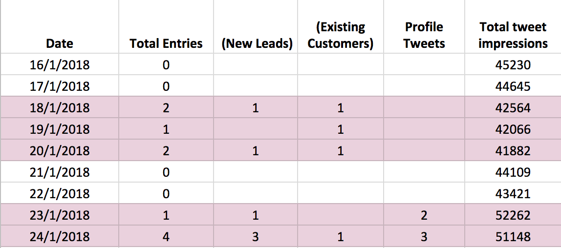 Going by the trend seen in the final spike in entries, we can conclude that new leads are probably generated from our content marketing efforts: Twitter users enjoy an article, decide to follow us on Twitter, see our header and decide to write in for a free account.