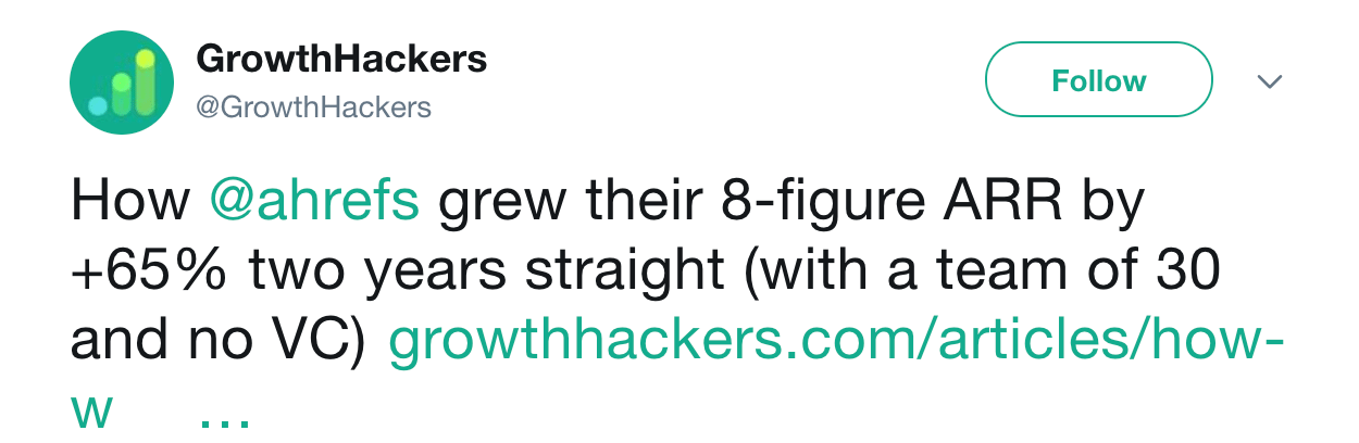 2. Ahrefs picked up a direct mention and article plug from the @growthhackers Twitter account with 187k+ followers. We can assume that some of their followers decided to follow Ahrefs on Twitter (or visit our profile to learn more about us) after reading the article. These people would have been exposed to our Twitter header and we suspect this is the main reason why we had an influx of entries.