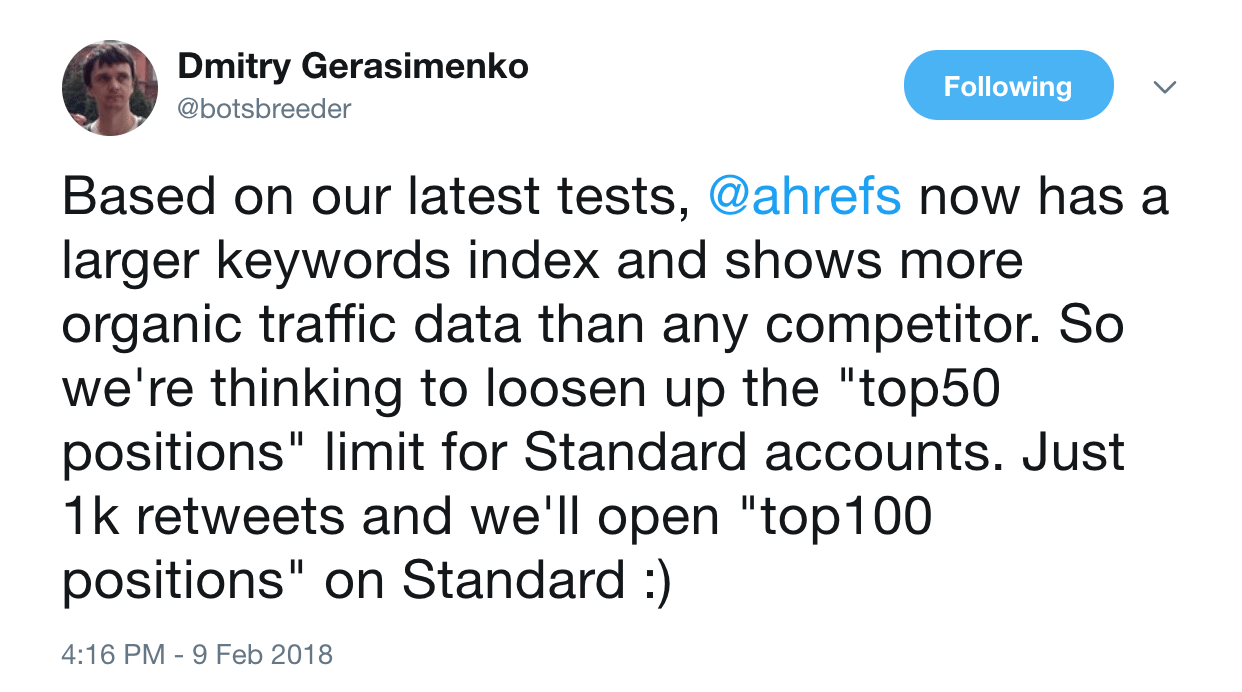 Starting off quick and easy: in February, we attempted to get 1k re-tweets on Twitter in order to loosen up a data limitation on one of our paid subscription plans.