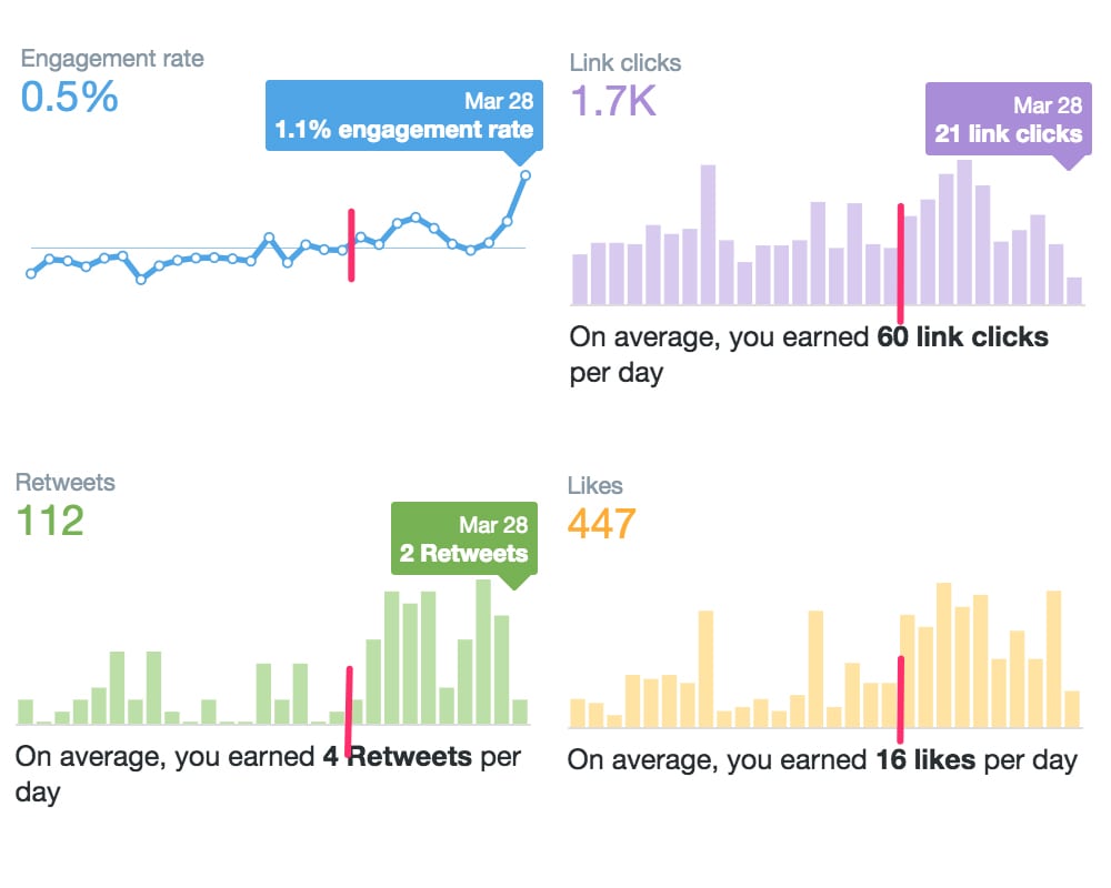 Above: red lines mark when we began the experiment. Engagement rate, link clicks, retweets and likes all showed a noticeable upward trend.