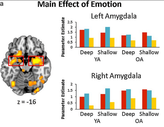 Here is a break-down of where in the brain our positive emotions arise, which tends to be in the Amygdala. Interestingly, in an experiment from Duke University, for Young Adults (YA) have more activity in the left Amygdala, whereas as we age and turn into Old Adults (OA), our place for positivity moves to the right Amygdala: