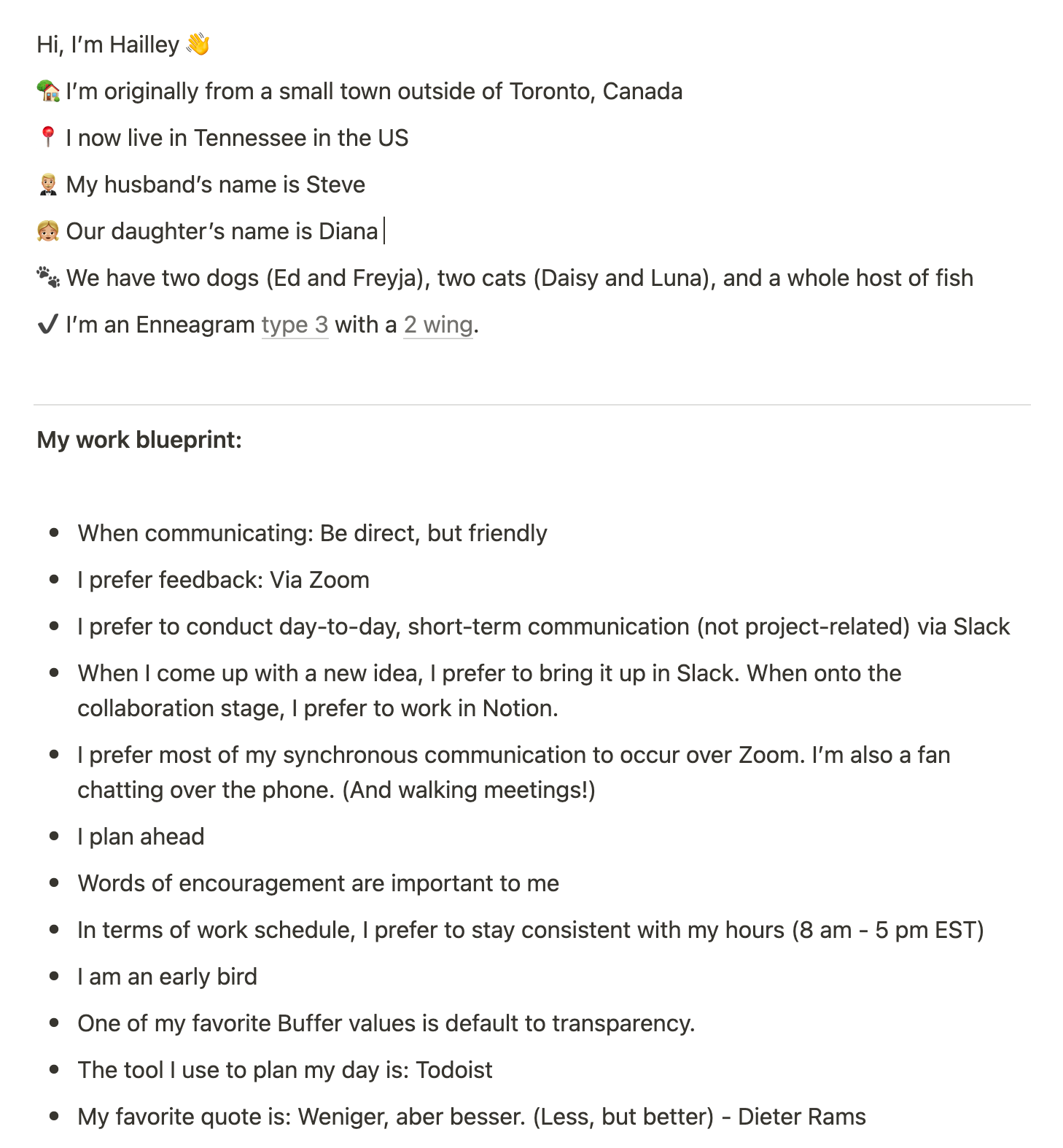 At Buffer, we've had assorted documents to communicate work preferences over the years. Some folks have kicked off specific documents called operating manuals or leadership blueprints. Still, we've never had anything centralized or standardized, which can be a superpower for this type of internal communication and collaboration, especially as a fully remote team.