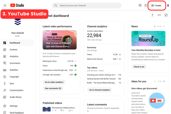 - In YouTube Studio, click the ‘Create’ button on the top right hand corner.