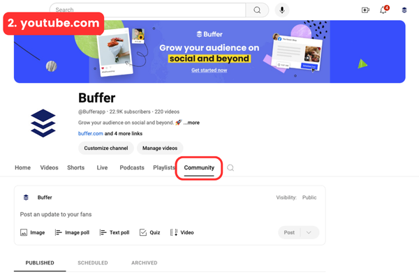 2. In the web version of YouTube, go to the ‘Community’ tab, where you’ll find the post composer.