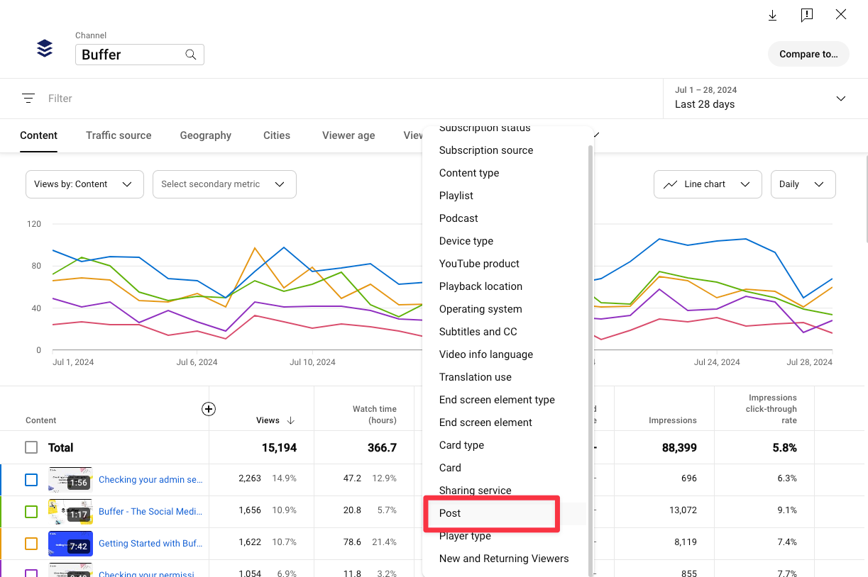 Here, you’ll find a list of all your posts, which you can filter by type or visibility. You’ll be able to edit and delete YouTube Community Posts from this tab, too.