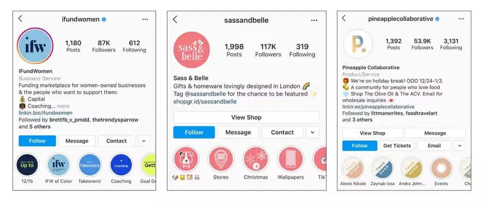 iFundWomen, Sass & Belle, and Pineapple Collaborative all use Instagram Highlights cover images to create a consistent look across their Highlights.