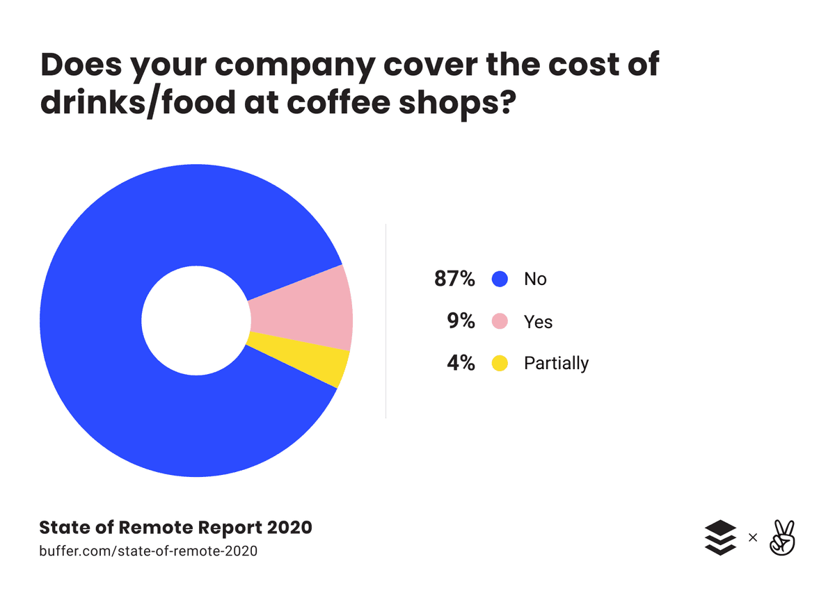 In our survey, we ask four questions about specific remote-work-related expenses that companies might cover for their remote employees. The expenses are home internet bills, drinks or food while working at cafés, coworking space memberships, and cell phone bills.