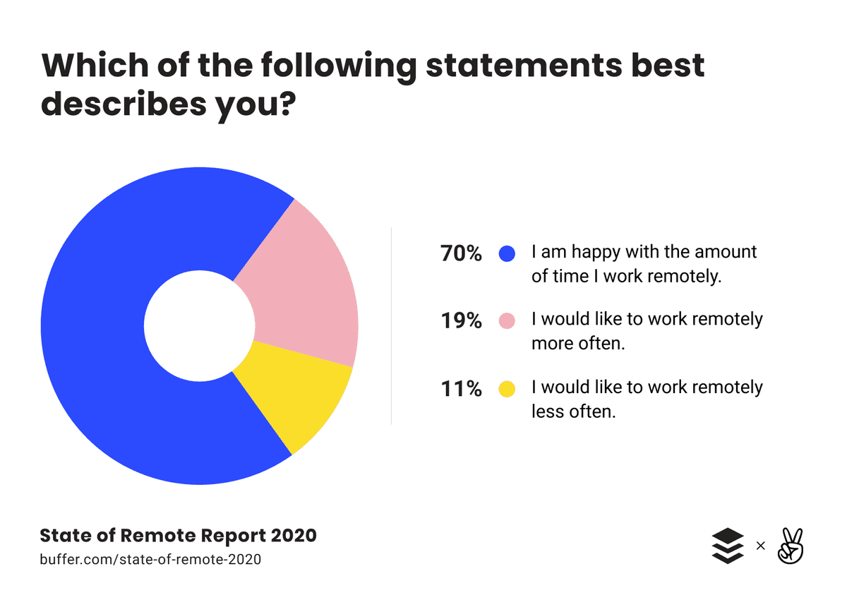 We can see a trend emerging here. The more time these workers spend working remotely, the more they tend to be content about it. The less time they spend working remotely, the more likely they are to want to do it more often.