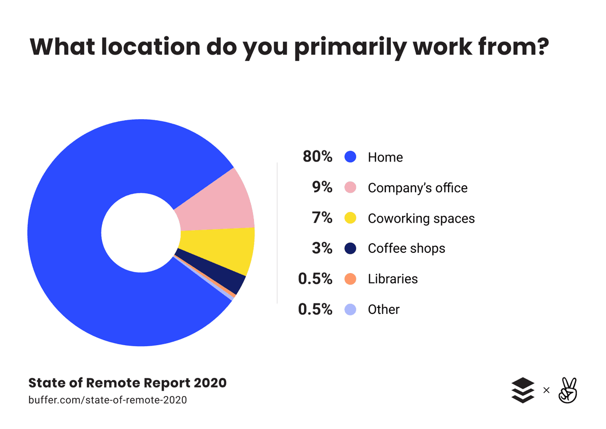 If you thought “in their homes,” you’d be spot on! While it seems like remote workers default to working at home (80 percent told us that’s their primary work location), a wide variety of them mix it up and work from other locations part of the time.