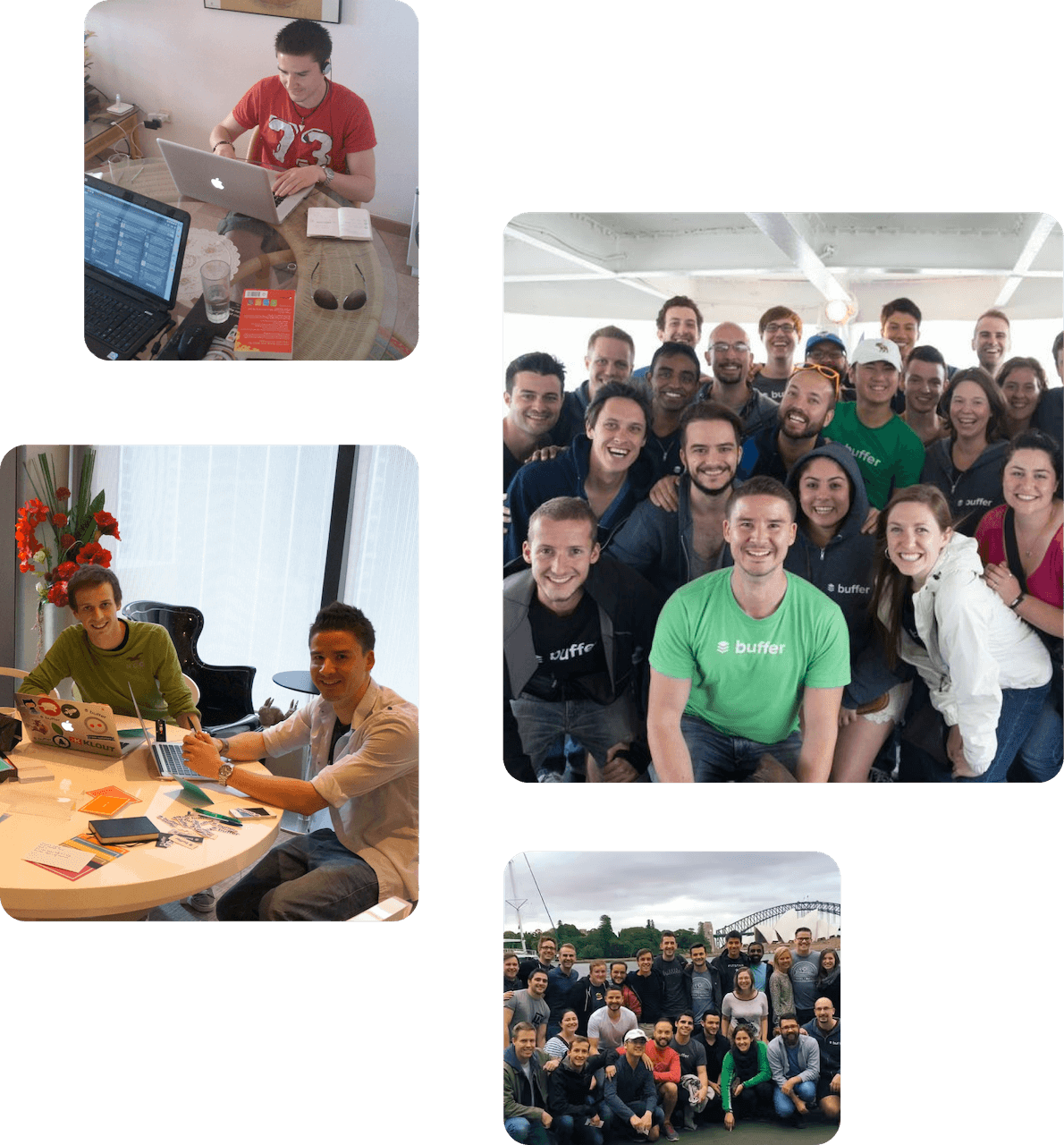 The Buffer team was initially just a few people working on a project they believed in, and steadily started growing after the founders joined an accelerator in August 2011. Over the next few years, Buffer teammates joined from wherever they were based as Buffer’s founders traveled and built Buffer. In 2013, we decided to commit to being a fully remote and distributed team, giving up our office space. That decision marked just one example of the Buffer team choosing our own path with how we operate as we build Buffer. We also share the whole team’s salaries, part of our value of transparency, and our whole company works a four-day work week.