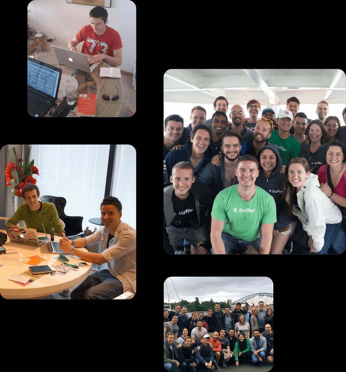 The Buffer team was initially just a few people working on a project they believed in, and steadily started growing after the founders joined an accelerator in August 2011. Over the next few years, Buffer teammates joined from wherever they were based as Buffer’s founders traveled and built Buffer. In 2013, we decided to commit to being a fully remote and distributed team, giving up our office space. That decision marked just one example of the Buffer team choosing our own path with how we operate as we build Buffer. We also share the whole team’s salaries, part of our value of transparency, and our whole company works a four-day work week.