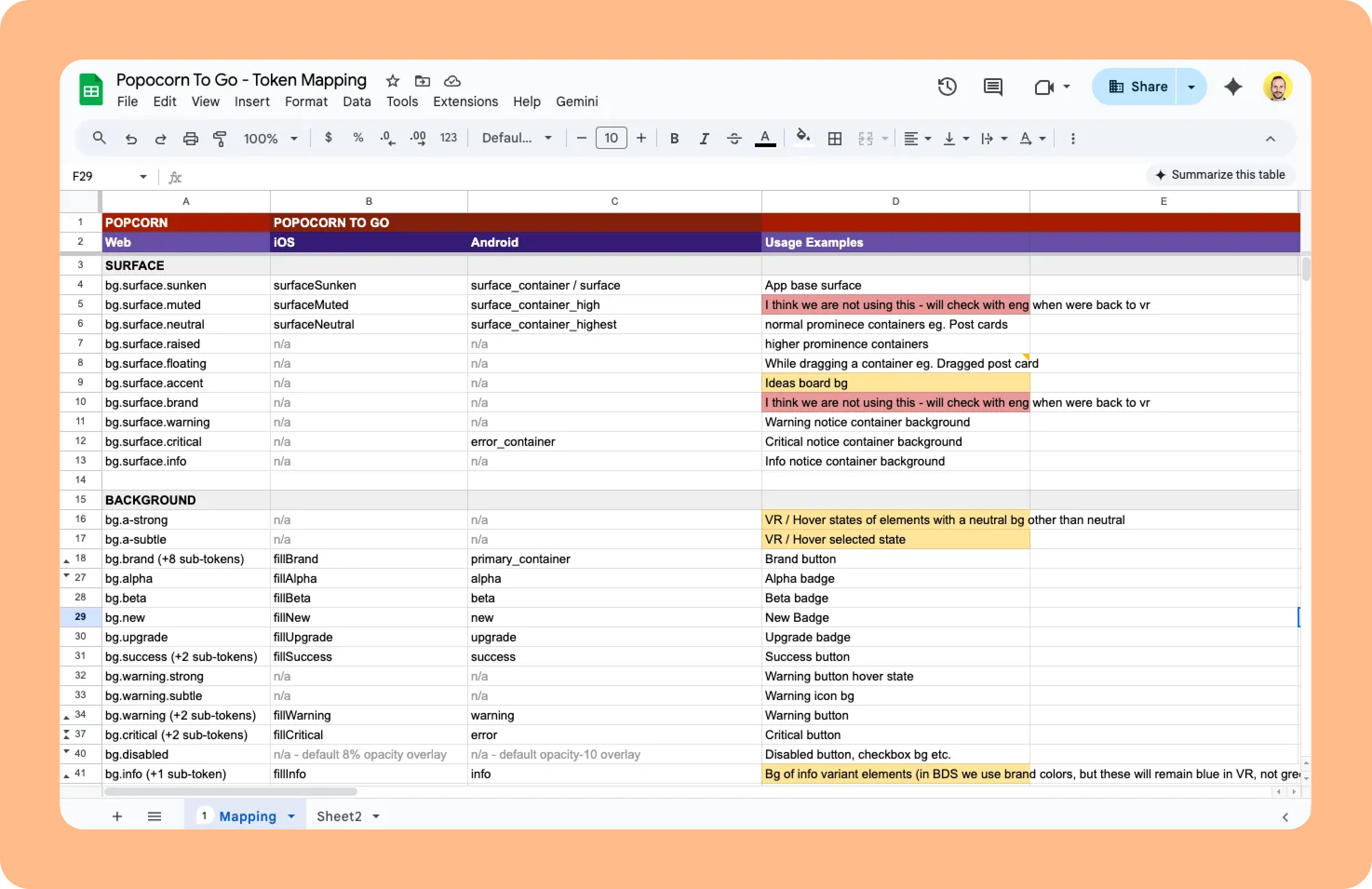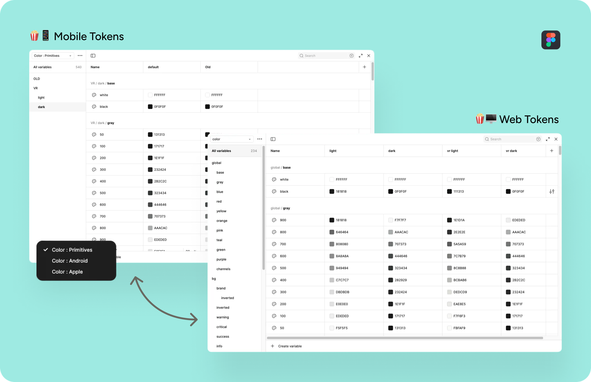 - Figma linking: The biggest challenge we faced was linking primitives. In an ideal world, the primitive colors would come directly from our main design system, Popcorn, and Popcorn To Go would simply map these to Android or Apple-specific tokens. However, Figma's current feature set doesn't support this. We had to create a new primitives file for Popcorn To Go that manually mirrors the web's primitives.